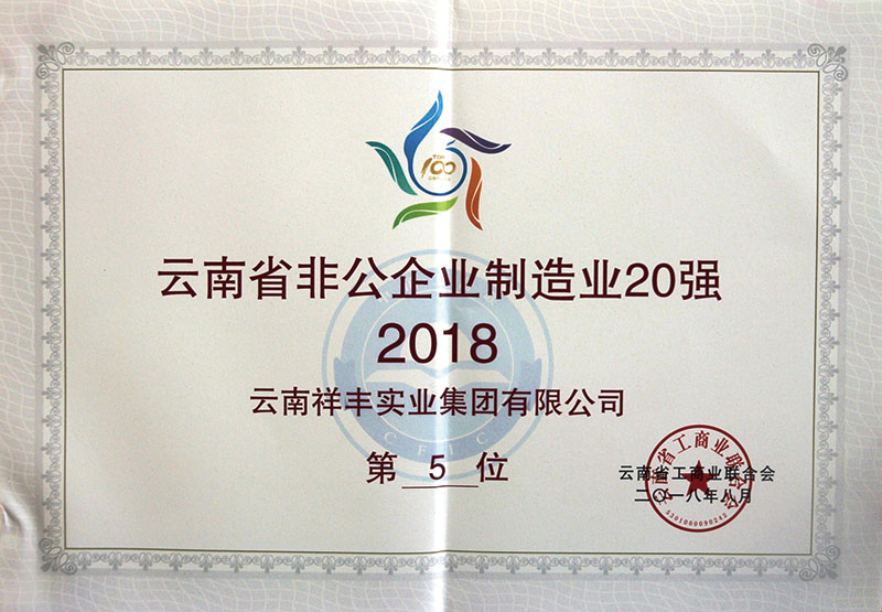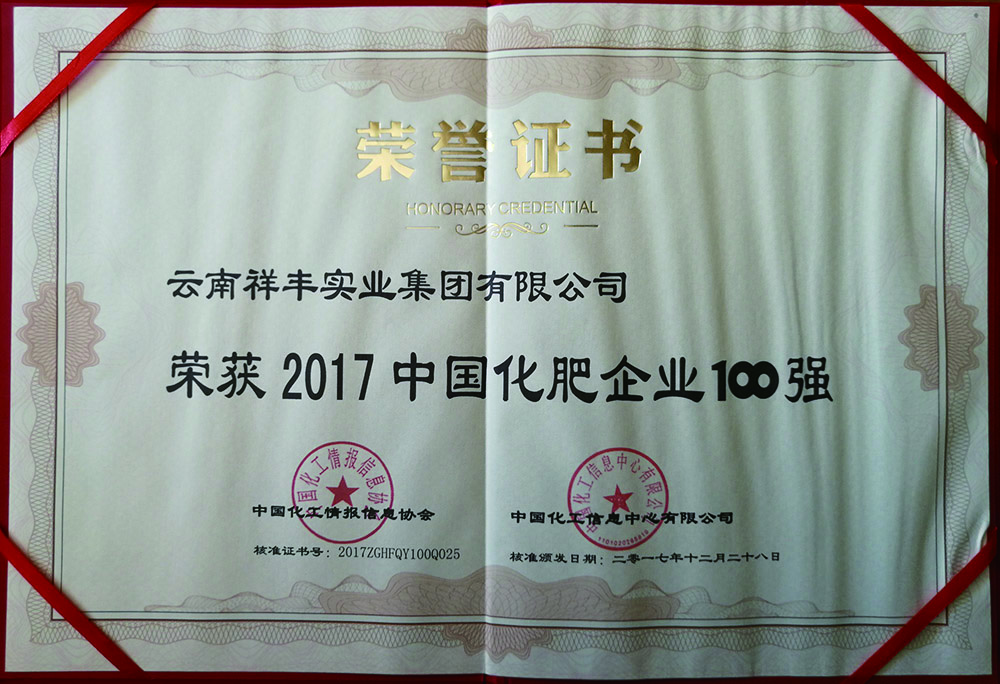 2018年12月16日,2018(第十一屆)中國(guó)化肥企業(yè)100強(qiáng)發(fā)布會(huì)暨國(guó)家化肥品牌計(jì)劃高峰論壇在山東青島舉行。云南祥豐集團(tuán)位列中國(guó)磷復(fù)肥企業(yè)100強(qiáng)第十名,中國(guó)化肥企業(yè)100強(qiáng)第十九名